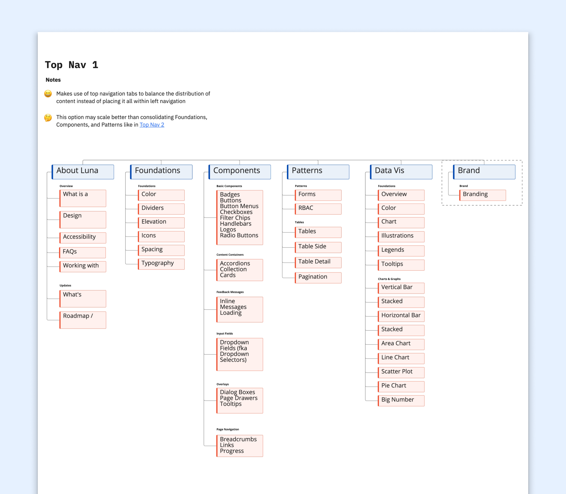 After auditing, I mapped the Information Architecture that we would use for Zeroheight by exploring various options and considering how each would scale.