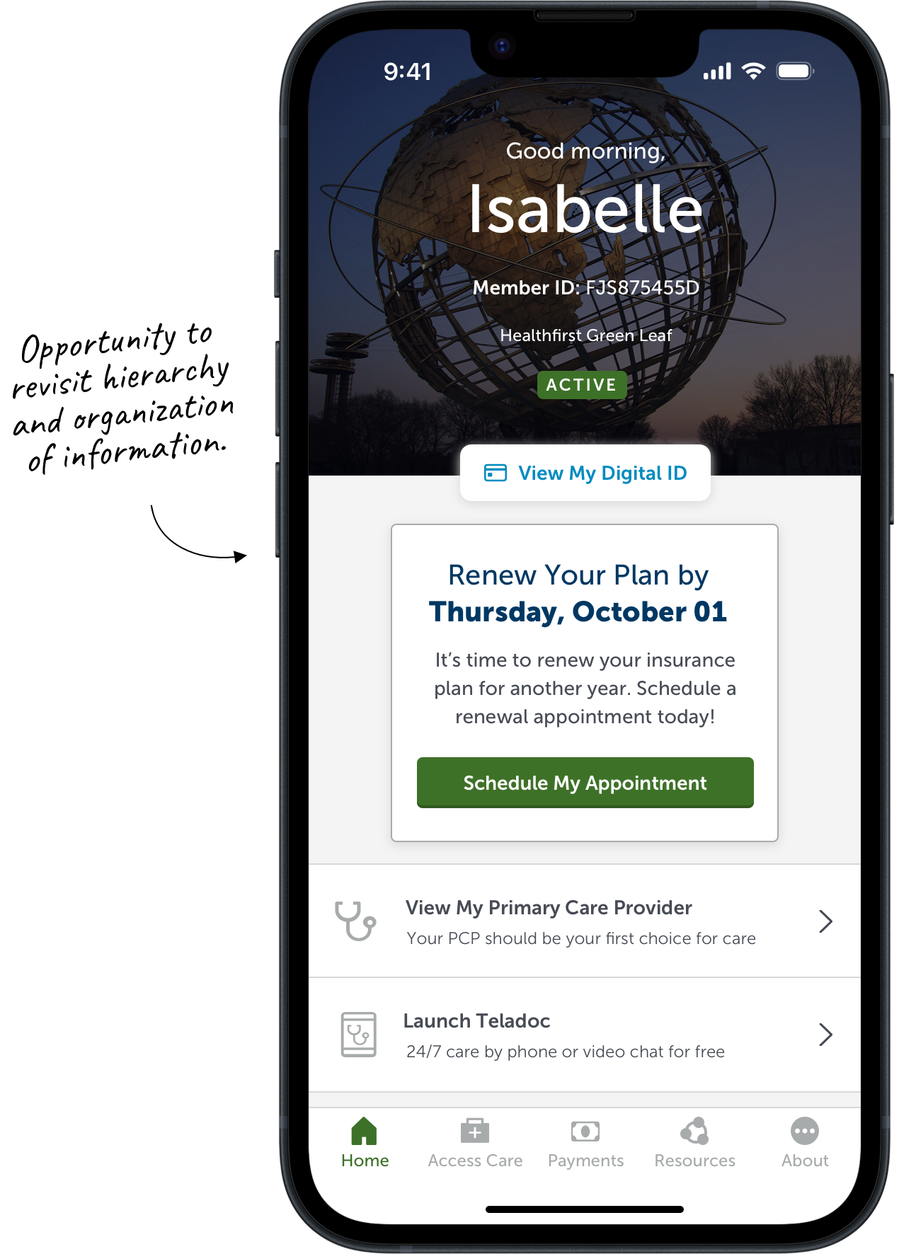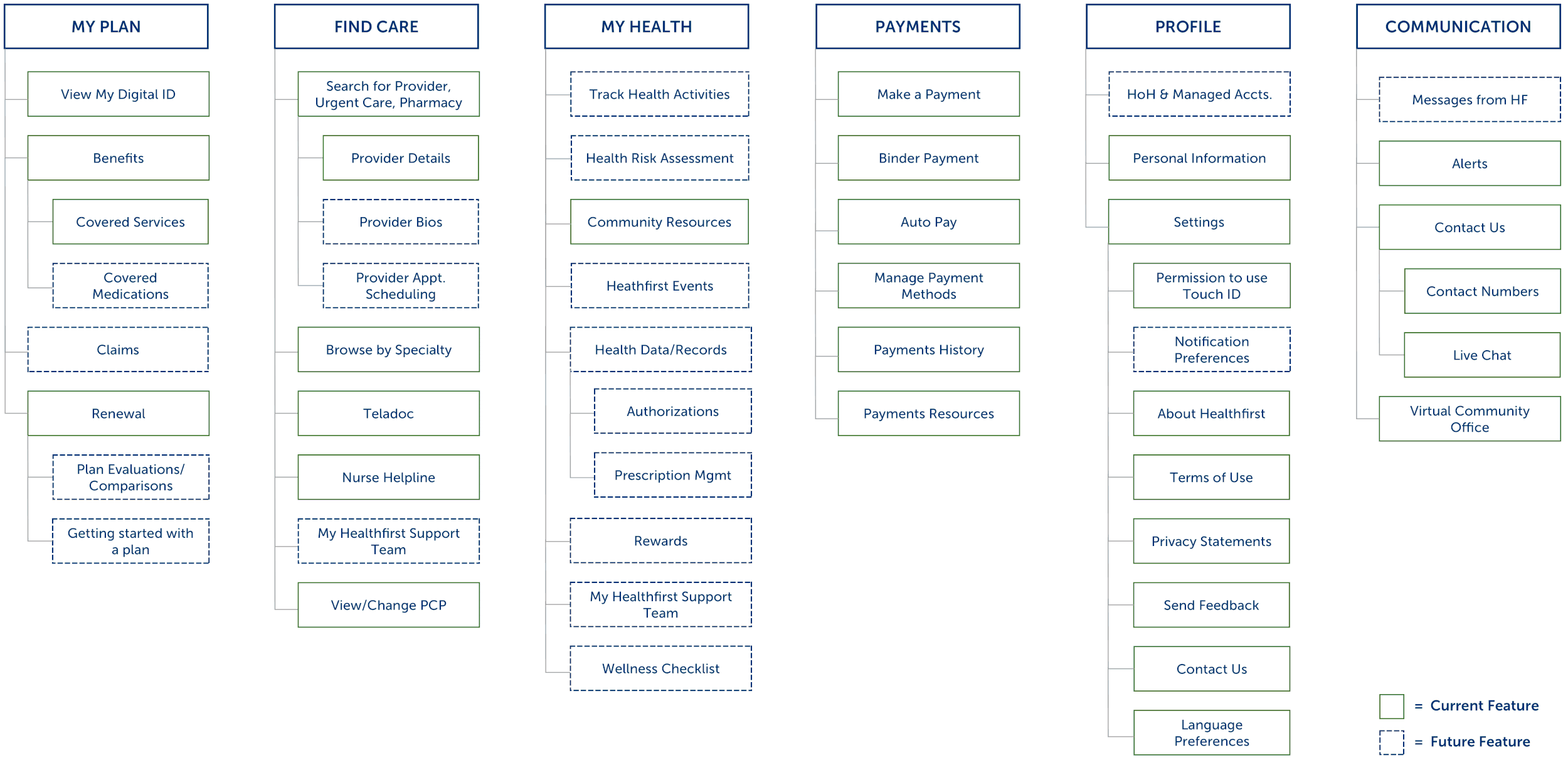 The Healthfirst mobile app was quickly outgrowing its current information architecture (IA) as future features on the roadmap did not have a place within the existing structure. I led the redesign of the new IA to work with existing content and scale for the future.