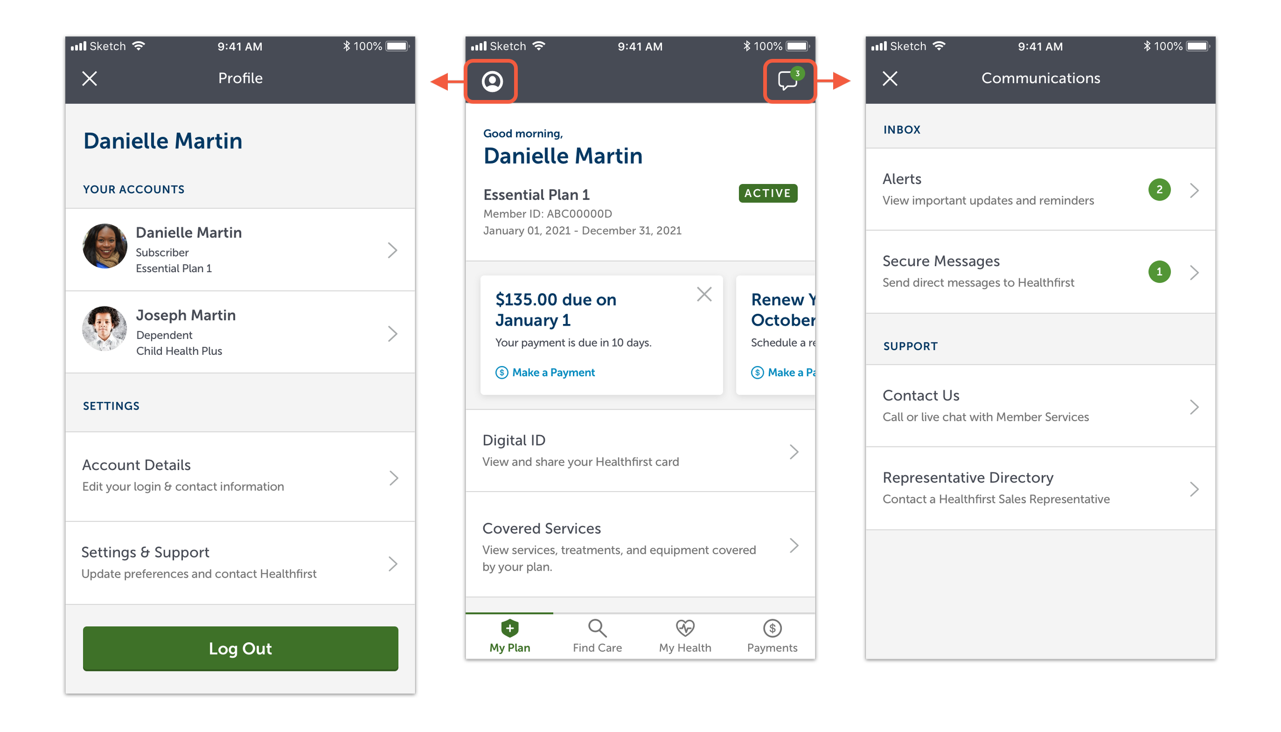 Insights from the card sort and design evaluation demonstrated that the proposed info architecture aligned with mental models of members. However, while many of these features were in alignment, there were some future items that would need further consideration and research such as Claims, Community Resources, Authorizations, and Rewards.