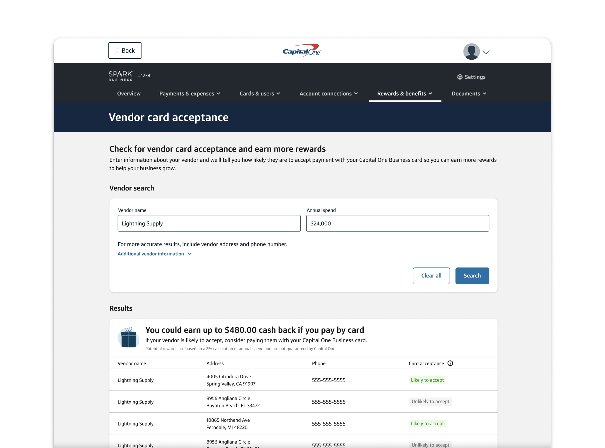 Our vendor card acceptance tool helps customers determine which of their vendors will accept card payments. By putting more spend on their card, they can earn more rewards.